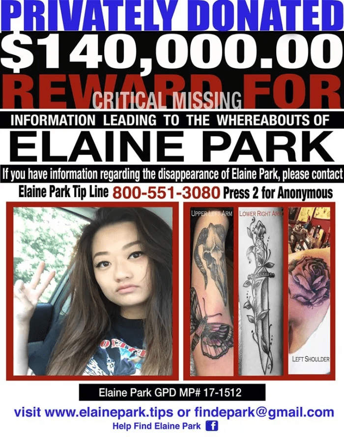 Elaine Park’s story is a tragic one that has captured the attention of many. It is mysterious with soooo many twists and turns, you can’t believe it’s actually is a real story. Elaine has now been missing for 6 years. This case is particularly mysterious because Elaine appears to be an individual who is very unlikely to run away; however, the police have zero evidence of any foul play. Despite the suspicion of foul play, the case has remained a missing persons.