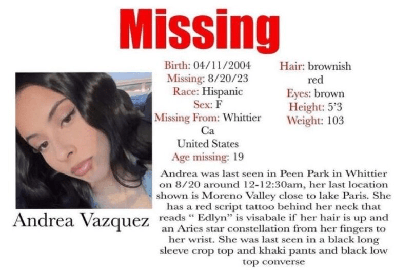 In a statement following her kidnapping, police said that Vazquez was last seen wearing a black long-sleeve crop top, khaki pants, and black low-top Converse shoes. “She has a tattoo of ‘Edlyn’ on the back of the neck, Aries constellation on the top of her right hand and a belly button piercing,” the statement read.