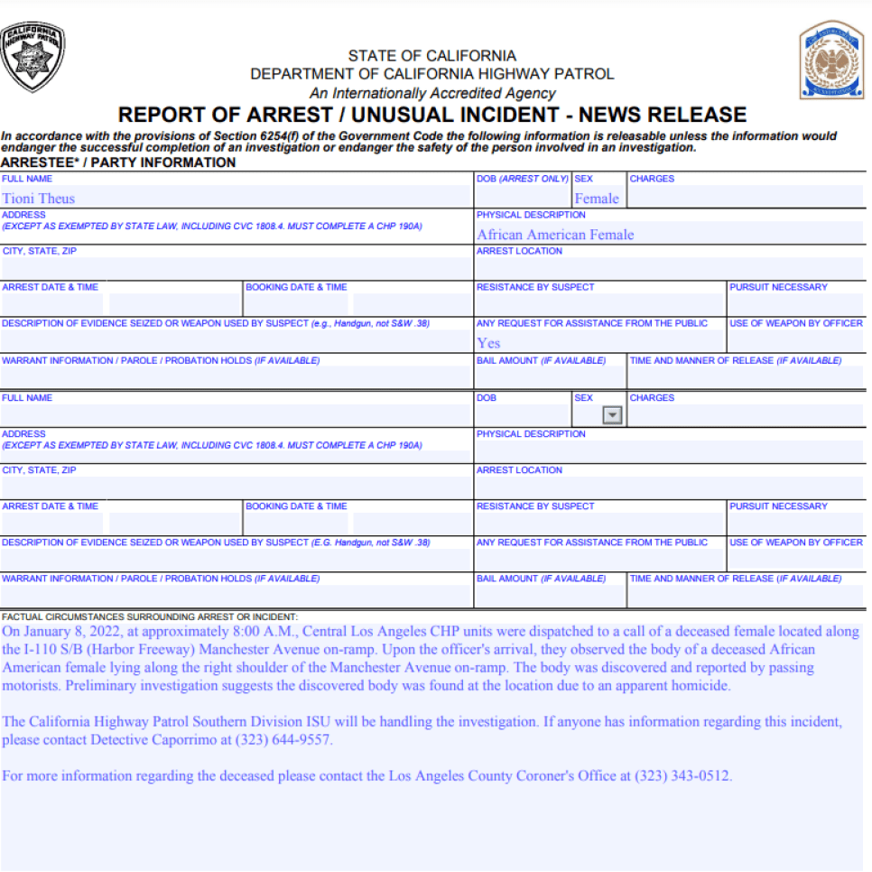 Because Tioni’s body was found on a highway on-ramp, the investigation into her murder is being led by the California Highway Patrol. The Los Angeles Police Department is assisting. I spoke to CHP Officer Alec Pereyda, who mentioned Tioni’s case is an ongoing investigation. He asked that anyone with information call (323) 644-9557.